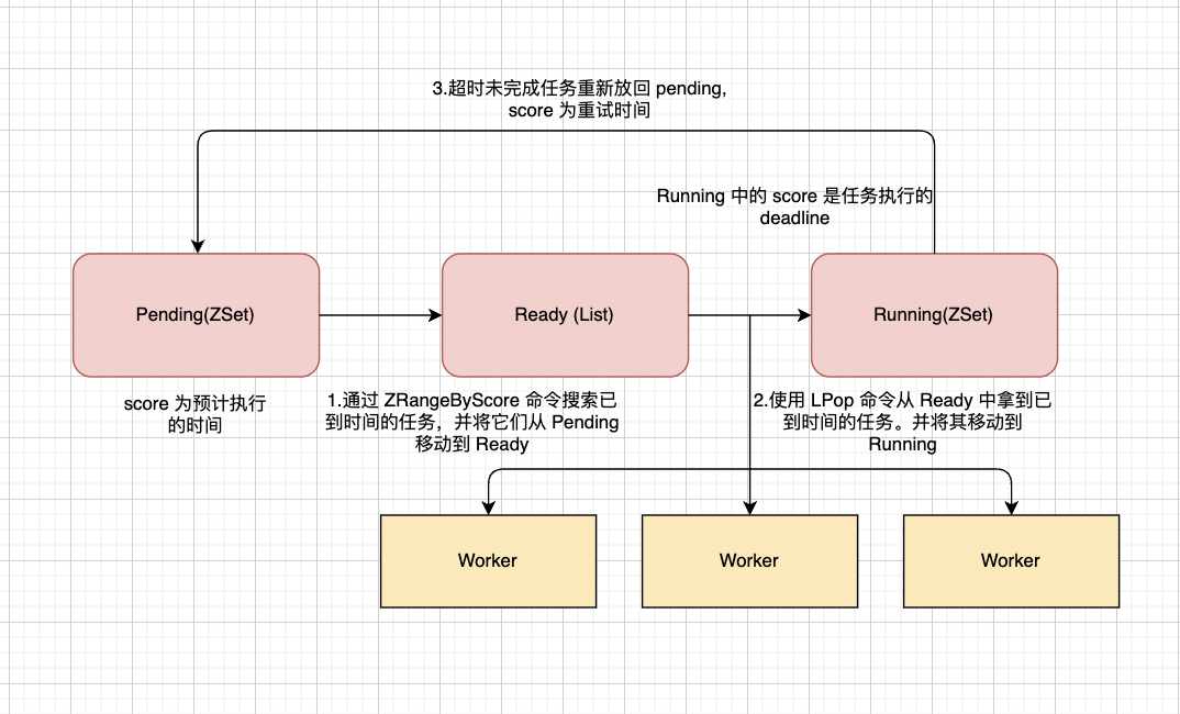 我们可以再引入一个名为 Running 的 ZSet, 它的 score 是任务执行的 Deadline。同样用一个 lua 脚本定时扫描 Running 将超时任务放回 Pending 即可实现任务的重试功能,进一步提升可靠性。